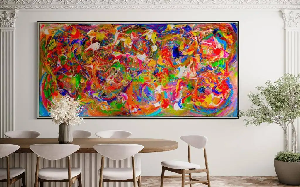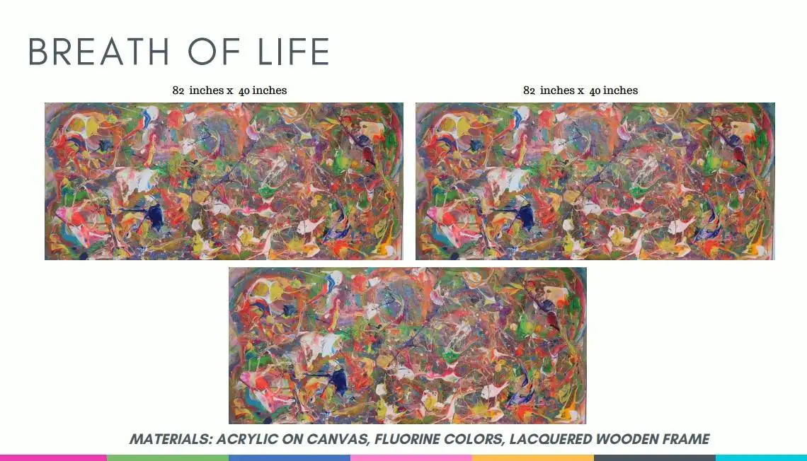 "Breath of Life" captures universal creative spirit and the balance of the terrestrial world. The work fuses plants, animals and humans in a network of positive energy. This abstract painting symbolizes the creation and union of living beings connecting them in harmony. The piece visualizes natural interaction between earth and the universe including elements such as wind, fire, water and earth.