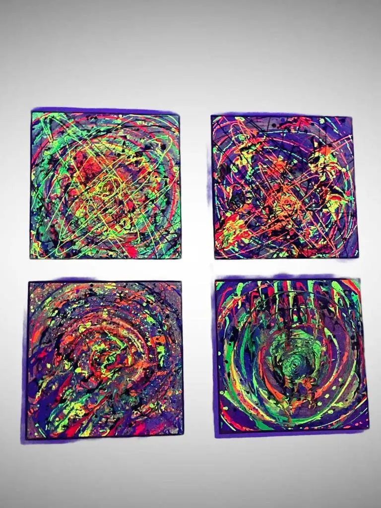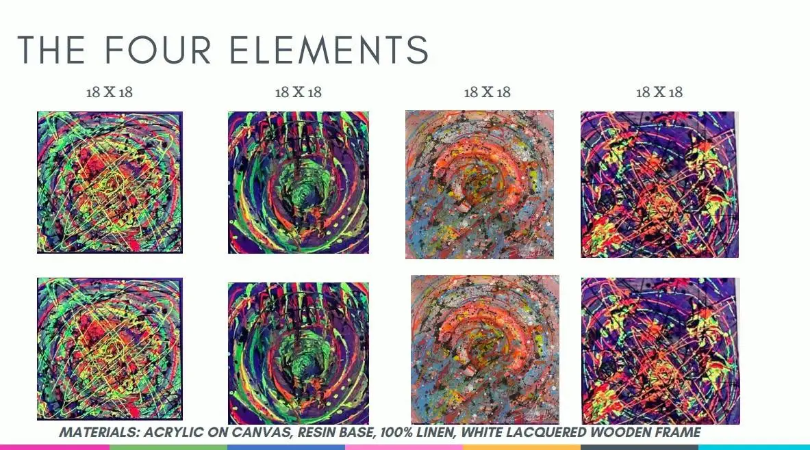"The Four Elements" reflects the cosmic conception of Mayan culture based on a triadic harmony. The Mayan universe is composed of three planes: the sky, the earth and the underworld each extending in four directions. The work abstracts this idea incorporating symbols such as ceibas, birds, types of corn and sacred colors.